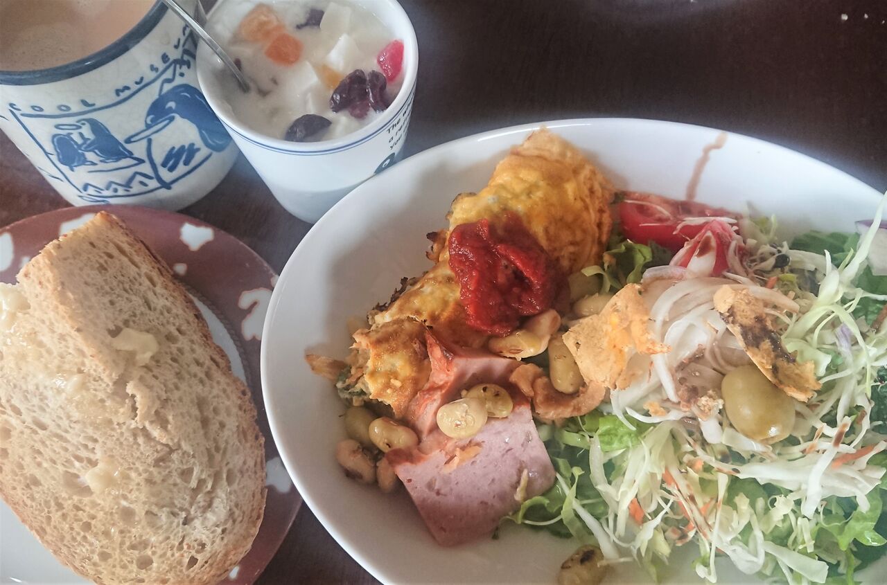 【写真】6月4日の朝食。ライ麦パン(札幌グランドホテル)、トラピストバター、カフォ・オ・レ、ドライフルーツ入りヨーグルト、野菜サラダ(バルサミコ酢)、オムレツ(具は夕食の残りの野菜炒め、ケチャップは江別市の農家産)、ミートローフ。ヨーグルトと牛乳はセコマの豊富町産。コーヒー豆はノースライブコーヒー(野幌駅前)。